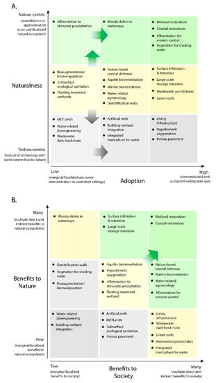 For this analysis, we chose twenty-seven NbS from diverse fields to bridge disciplinary boundaries, including: restoration ecology, blue-green infrastructure, ecological engineering, and environmental engineering. The NbS were selected to highlight the breadth of techno-ecological innovation across time (from present, to near-term future), and place (from local/niche to globally widespread). NbS included are those that both directly sustain existing or create new ecosystems in nature (e.g., forests, wetlands, coastlines, greenspaces) and address water security challenges for society, specifically: improving quality, improving quantity, and/or reducing water-related risk. Thus, indirect supports of nature (e.g., wastewater resource recovery that could displace land use by bioenergy crops [22,23]) were excluded. To limit scope, we focus our discussion on product-like NbS (e.g., restoration, blue-green infrastructure, ecological engineering), and exclude process-like NbS (e.g., conservation, demand management, governance and finance innovation), recognizing that these are complementary, often with greater imperative, to sustainability transitions [24,25,26,27]. We include NbS involving ecosystems across biota scales, from microbiota (e.g., bacteria, archaea, fungi, phytoplankton, zooplankton, protozoa, etc.), to macrobiota (e.g., plants, insects, bivalves, fish, mammals, etc.). We include large and small-scale NbS across spatial landscapes—not just in the urban context (although we include urban greenspaces a part of nature for the purposes of this analysis). We acknowledge that most NbS discussed here are ecosystems designed for the benefit of humans; purported benefits to nature are often those that are also valued by humans (e.g., biodiversity protection, climate change mitigation, aesthetics) [28]. We draw inspiration from both NBIS [16] and techno-ecological synergy (TES) [29] frameworks in our comparitively simplified methodology and discussion on innovation in NbS for water.