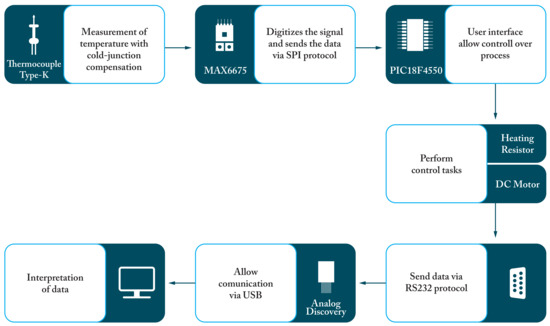 The prototype requires a temperature variable to control the behavior of the heating element during the process. The PID controller is proposed as the best option to keep the heating element at the same temperature level. For implementing the PID, Equations (6)–(8) are required for controlling the temperature. One of the proposed ideas is to vary the Direct Current (DC) motor velocity to verify if it can improve the cutting process. The glass bottle touches the heating element once. Rotating the bottle is essential to keep the same temperature on the cut line. This controller is open-loop, and no variable is required as feedback because a Pulse Width Modulation (PWM) signal is used. Thus, the unique variable used for controlling is the temperature. A thermocouple type-k and the MAX6675 module are proposed for this task—see Figure 3.