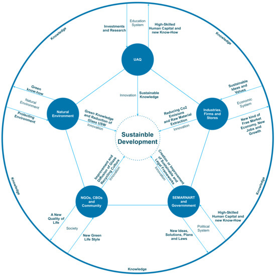 According to [31], in the context of global warming and promotion of sustainable development, feasible, sustainable development is described when investments flow in the education system helix. It creates suggestions and impulses for knowledge creation and impacts human capital for sustainable and greener development, which serves as new knowledge for the economic system. In the economic helix, new types of green services and products exist with the creation of new types of jobs.