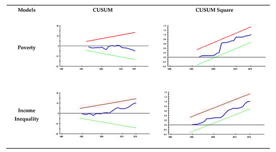 The results of the income inequality model are also displayed in Table 5. The results reveal that the investment portfolio’s coefficient has a negative sign but is statistically insignificant both in the long and short run. Hence, there is no evidence of a relationship between portfolio investment and income inequality. The coefficient of democratic accountability is negative and statistically significant in both the long and short run. Hence, increasing democratic accountability helps to reduce income inequality in Pakistan. In another interpretation, decreasing democratic accountability would increase income inequality. The literacy rate has a large negative effect on income inequality. The coefficient of lnLITt shows that a 1% increase in literacy rate could reduce 0.84% of the income inequality in the long run. Hence, increasing the literacy rate may play a significant role in reducing income inequality. This relationship behaves the same way in the short and long run. The long and short-run coefficients of inflation and remittance are positive and statistically significant. Hence, the increasing inflation and remittance would increase the level of income inequality in Pakistan. The coefficient of lnCPIt shows that a 1% increase in the consumer price index may increase income inequality by 0.36% in the long run. In contrast, controlling inflation would be beneficial to reducing income inequality. Further, it also corroborates a fact in Pakistan that increasing inflation helps rich people become more prosperous and vice versa. The coefficient of lnREMITt shows that 1% increasing remittance would increase income inequality by 0.12% in the long run. On the other hand, decreasing remittance would decrease the level of income inequality. In the short run, the coefficient of ECTt−1 (−0.42) shows a convergence toward long-run equilibrium in almost two years and five months. Figure 1 shows the testing of the stability of the selected ARDL models.