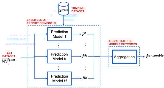 A typical ensemble of models for energy production prediction is shown in Figure 1. A training dataset X t r a i n , which comprises the weather-forecasting data ( W F ) and the associated energy productions ( P ), is utilized for building the individual models of the ensemble (hereafter called the base models). Once constructed, the ensemble provides the prediction of the energy production ( P ^ e n s e m b l e ) for any new coming test pattern, whose input weather-forecasting data W F j t e s t at time t j is provided by a weather-forecast model. For this, the ensemble performs two steps [35,66]: (1) energy production predictions by the individual prediction models, and (2) aggregation of the energy production predictions.