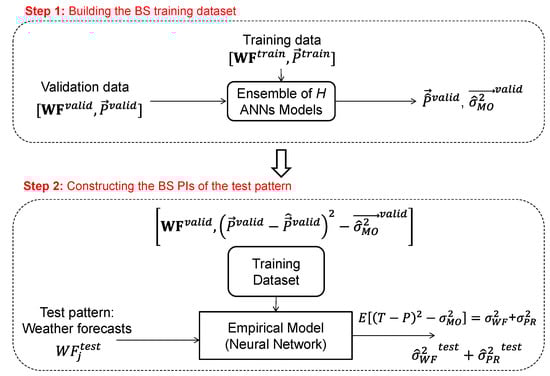 Step 2: Constructing the BS PIs of the test pattern. The BS training dataset X B S t r a i n = [ W F v a l i d , ( P v a l i d P ^ v a l i d ) 2 σ M O 2 v a l i d   ] formed by the weather-forecasting data of the validation dataset, W F v a l i d , and the squared prediction errors of the ensemble on the energy productions of the validation dataset, ( P v a l i d P ^ v a l i d ) 2 σ M O 2 v a l i d is built. Notice that ( P v a l i d P ^ v a l i d ) 2 σ M O 2 v a l i d contains the contributions to the overall error σ ε 2 caused by sources of uncertainty 1 and 2.