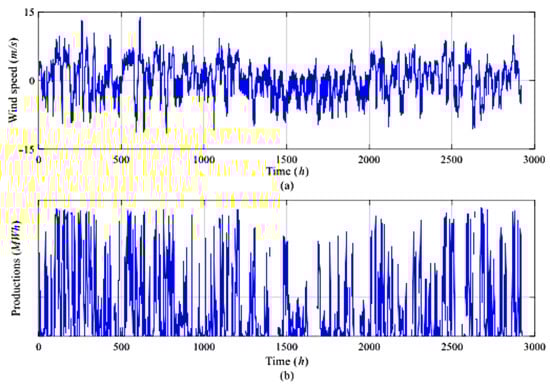Figure 3. (a) Wind speed; (b) related wind energy productions of the year 2013.
