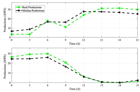 Figure 4 shows two examples of energy production predictions (squares) and the corresponding true values (circles) for two different days of the year 2013. It can be seen that the estimated productions are reasonably close to the actual production values, although in some cases, the prediction error is not negligible (e.g., t = 6 h).