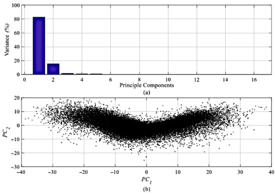 Figure 6. (a) Variance accounted by each principal component; (b) overall dataset in the space of the two identified principal components.