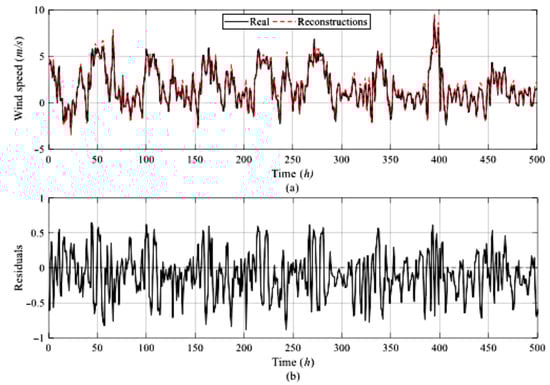 Figure 7. (a) Reconstruction of a wind speed signal using the identified principal components; (b) corresponding residuals of the reconstructions.