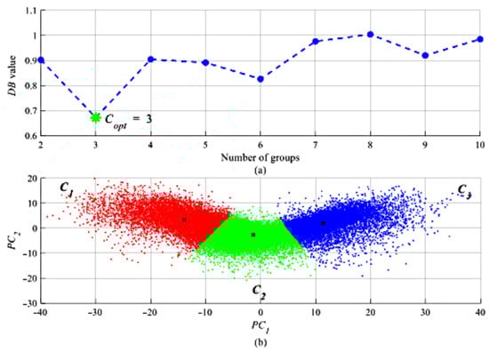 Figure 8. (a) DB values vs. number of groups; (b) the obtained groups in the space of the identified principal components.