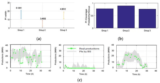 Figure 9. (a) Average PI widths; (b) average PI coverage values with respect to the three weather forecast groups; (c) examples of the estimated PIs of few data in the three weather conditions.