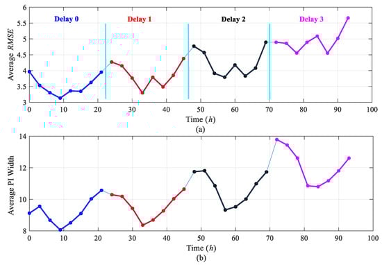 Figure 10. (a) Average RMSE and (b) average PI width obtained by the BS technique for four-day ahead predictions.