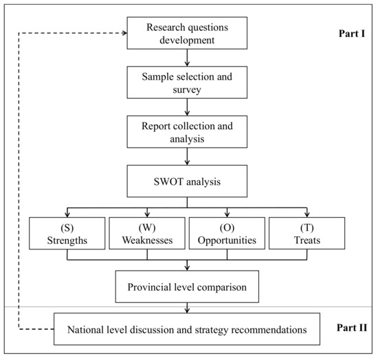 A modified research structure was developed with reference [7]. The research is divided into two parts (Figure 2). Research questions were developed at first and then data was collected by a survey conducted in the five major production provinces located in north (Inner Mongolia, Heilongjiang and Jilin), middle (Shanxi) and south (Yunnan) China. Applying SWOT analysis to each province, which is the acronym stands for Strengths, Weaknesses, Opportunities and Treats, is a common approach used to analyze strategic cases in the strategic management process [8]. The factors that affected industry development are identified into internal (“S” and “W”) and external (“O” and “T”) sectors and used to seek a fit between the two perspectives [9]. The SWOT analysis was adopted widely at single enterprise [10], industry [11], regional [12] and also cross-national level [13,14]. The approach was successfully used in agricultural aspects in recent years for constructing a map of suitable areas for introducing new crops [15] and for creating a competitive market for organic farming [16], etc.