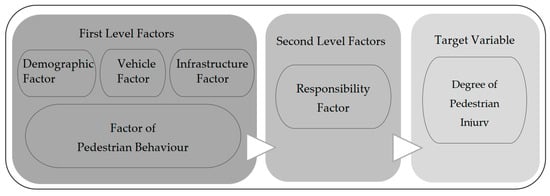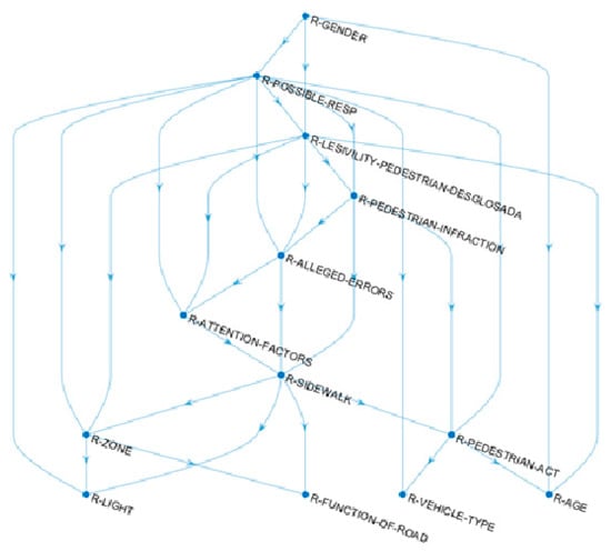 It is also important to note the direct connection of the degree of injury variable with pedestrian behaviour variables, such as “attention factors”, “alleged errors”, “pedestrian violation” and “pedestrian action”, as well as its close relationship with the variable “pedestrian responsibility”. All these interactions generate important changes in the probability of a pedestrian’s degree of injury, which can be verified in the results section.