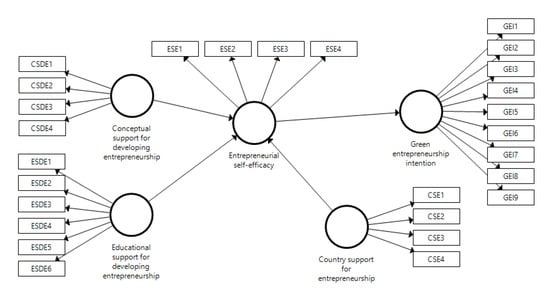 Conceptual support for developing entrepreneurship: CSDE; Country support for entrepreneurship: CSE; Educational support for developing entrepreneurship: ESDE; Entrepreneurial self-efficacy: ESE; Green entrepreneurial intention: GEI.