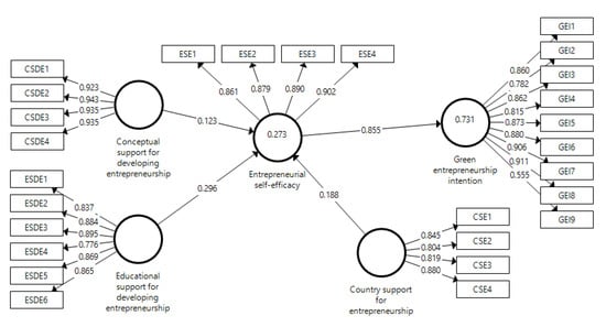 Figure 1 shows the research model detailing the relationship between the study variables. The model includes education development support, conceptual development support, and country support through entrepreneurial self-efficacy and green entrepreneurial intention. The circles represent each variable of the study, and the rectangular boxes indicate items for each variable.