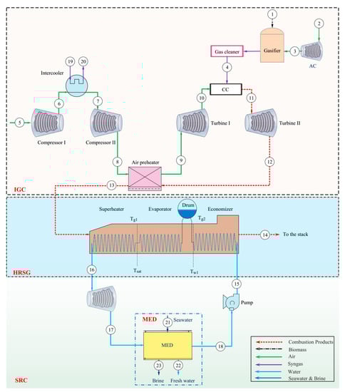 Schematic of the proposed integrated gasification combined cycle for electricity and freshwater production.