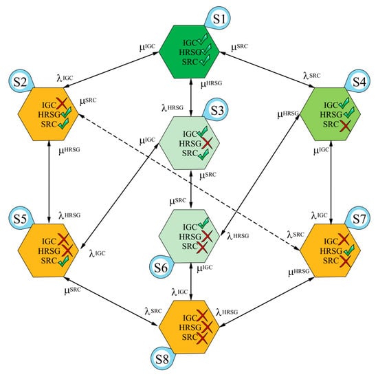 There are several methods to analyze a system from a reliability perspective. In the present study, Markov chain analysis is used for the reliability assessment of the system. The Markov method can model the stochastic behavior of systems that change continuously or discontinuously with time or in the state space. The behavior of the systems should also indicate memorylessness of the exponential distribution. More specifically, failure and repair rates in the system are time-independent. Otherwise, the processes are called non-Markov. To facilitate the analysis of Markov’s continuous and discontinuous processes, a state-space diagram is used. All possible states for the system and ways to change each state are presented along with the change rate in the state-space diagram. The state-space diagram of the proposed system, which describes different states and relationships between the state, is illustrated in Figure 3. Note that, for the subsystems (IGC, HRSG, and SRC), there are possible functional states based on the combination of the possibilities for the failure or operation of the subsystems [].