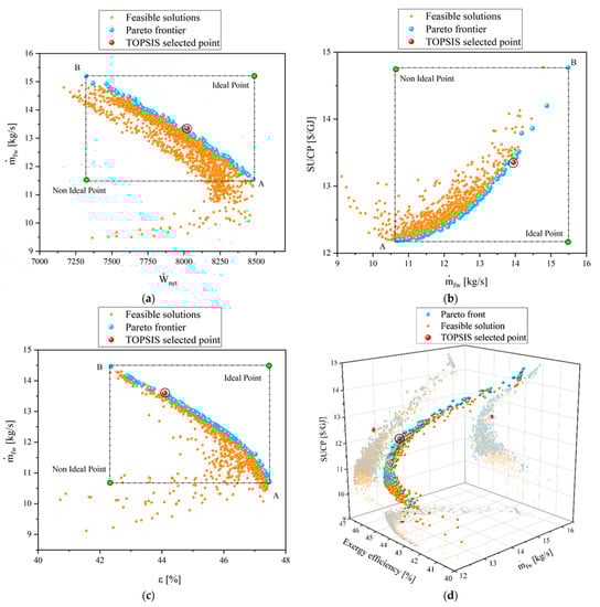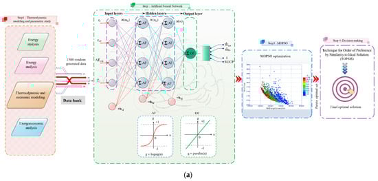Figure 4a demonstrates the optimization process which involves the coupling of thermodynamic models of the proposed system to the artificial neural network and shows the coupling between ANN and MOPSO. Moreover, the flowchart of the MOPSO algorithm is shown in Figure 4b. Additionally, as seen in Figure 4a, the last step in the optimization process involves selecting optimum points. In this regard, the TOPSIS (technique for order of preference by similarity to ideal solution) decision-making method is used. The TOPSIS method is a multi-attribute decision making (MADM) method that ranks alternatives. In this method, the two concepts of “ideal solution” and “similarity to the ideal solution” are used. As its name implies, the ideal solution is the best in every aspect, which generally does not exist in practice, and it tries to get closer to it. To measure the similarity of an alternative to an ideal solution () and non-ideal solution (), the distances of that alternative from the ideal solution () and non-ideal solution are measured. The alternatives are then evaluated and ranked based on the ratio of the distance from the non-ideal solution to the summation of distances from the ideal and non-ideal solution []. That is,