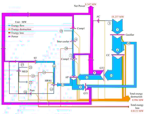 The exergy rates for all flows and the exergy destruction rates for the system components are shown in a Sankey diagram in Figure 5. The maximum amount of exergy destruction is related to the combustion chamber, which is mainly due to the nature of combustion reactions and heat transfer. Of the of total input exergy to the system, is destroyed in the combustion chamber. The second-largest exergy destruction rate is related to the gasifier, which is equal to . The rate of exergy loss for the overall system shown in the Sankey diagram is .