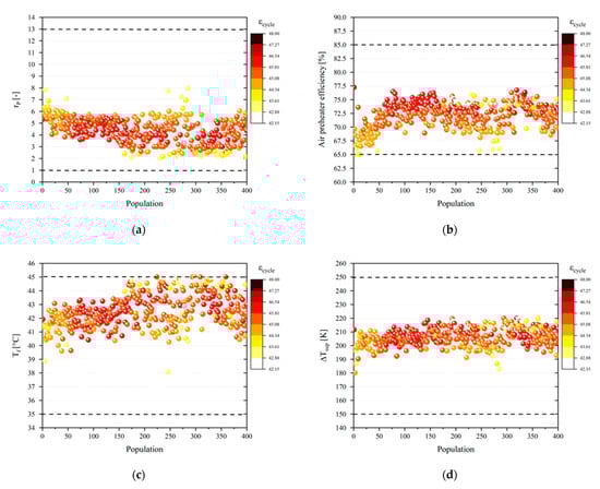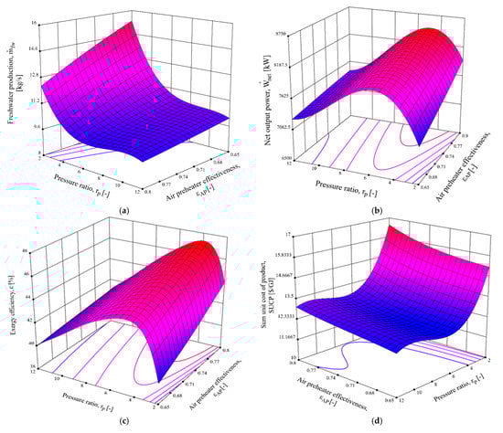 In the present study, four parameters, including compressor pressure ratio (), preheater effectiveness (), superheating temperature difference (), and feedwater temperature () are selected as design parameters. In addition, net output power (), exergy efficiency (), freshwater production rate (), and total unit cost of production () are considered as objective functions. Thus, the optimization space with the relevant constraints is as follows: