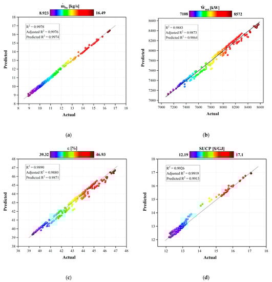 Employing the state data collected from the energy, exergy, and economic analysis for the proposed cogeneration system, a total of 1500 samples of input and output points were applied for the artificial neural network (ANN) training. The employed artificial neural network is presented as the fitness function of the MOPSO algorithm, and the multi-objective PSO optimizer is executed on it. Predicting the objective functions using ANN leads to a considerable decrease in the computational cost and run time. In order to evaluate the accuracy and efficiency of the neural network in estimating the responses and outputs, the coefficient of determination () index is employed. This indicator measures response data’s variance, and the closer the is to 1, the higher the ANN model’s accuracy.