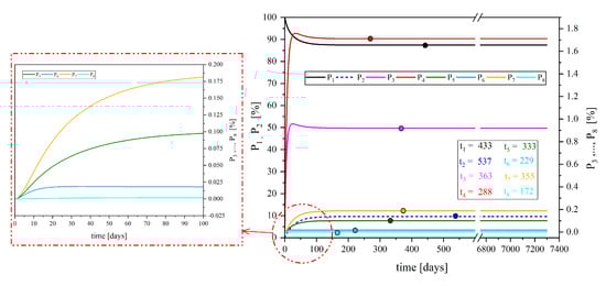 In this equation, , , and . For a specific value of , is defined as a probability that the time to failing is greater than or equal to . In reliability analysis, the cumulative distribution function (CDF) is used, which indicates the probability that a failure will occur before the time t and is defined as follows []: