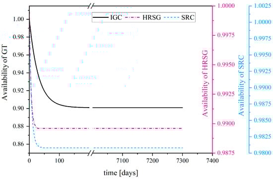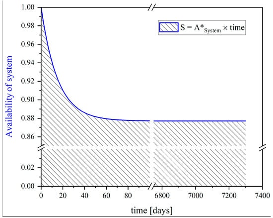 Another parameter used in the system’s reliability assessment is availability. Availability is defined as the probability that a component or system performs to its expected capacity at a specified point in time or over a stated period when maintained and operated in a prescribed demeanor. Availability is a different concept from reliability. It means that part of the system may have already failed but returned to normal function after the repair; hence, the value of availability is always higher than that of reliability []. For series systems, the relationships related to failure rate, repair rate, availability, and reliability are expressed as follows []: