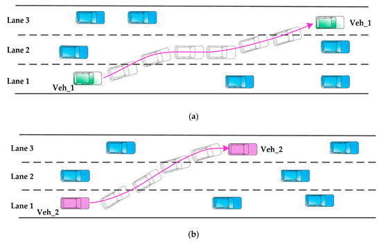 Schematic diagram of lane-changing scenarios, (a) normal lane-changing to a non-adjacent lane, (b) continuous lane-changing to a non-adjacent lane.