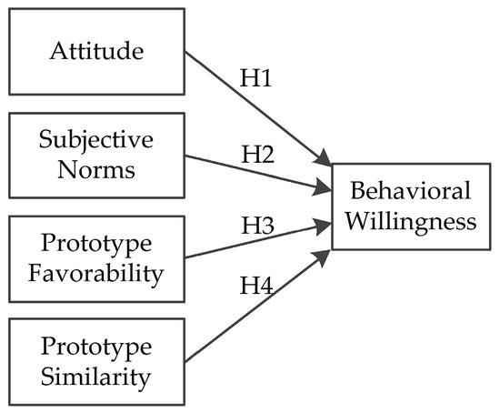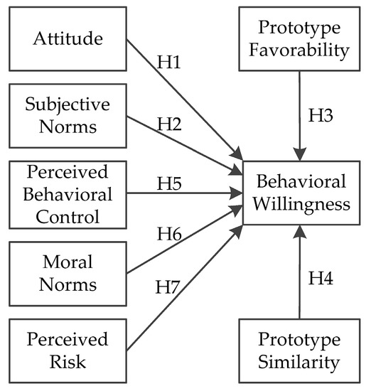 The PWM is an improved theory that specifically targets a young age group based on analyzing reasoned-path and social-reactive-path decision-making [40,41,42]. For reasoned path, the intention is predicted by attitude and subjective norms. The social reactive path considers unplanned and unconscious decision-making based on behavioral willingness and prototype perceptions. Prototypes reflect the image of a typical person engaged in certain behavior. According to the PWM, there were two kinds of prototype perceptions: similarity and favorability [40]. In the social-reactive path, behavior is directly predicted by behavioral willingness and indirectly predicted by prototype similarity and favorability. Both intention and willingness predict behavior.