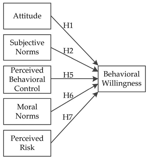 Table 6 presents the hypotheses test results. As moral norms were not significantly associated with behavioral willingness in Model 2 and Model 3, Hypothesis H6 was not supported. According to path analysis results, H1–H5 and H7 were supported.
