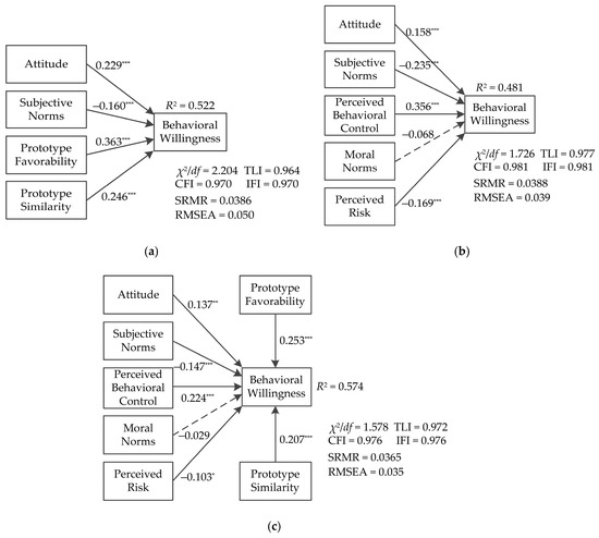 Structural model analysis results of the three models are shown in Figure 6. All the fit indices of the three models satisfied the recommended criteria. With regard to Model 1, the PWM factors of attitude (β = 0.229, p ≤ 0.001), prototype favorability (β = 0.363, p ≤ 0.001), and prototype similarity (β = 0.246, p ≤ 0.001) were all positively associated with behavioral willingness, while subjective norms (β = −0.160, p ≤ 0.001) were negatively associated. As shown in Figure 6a, Model 1 explained a 52.2% variance in young drivers’ willingness.