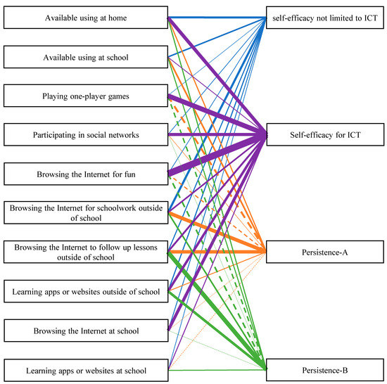 Relationship between self-efficacy not limited to ICT, self-efficacy for ICT, persistence-A, and persistence-B, and using ICT, in a multivariable generalized linear mixed model. The line thickness shows the magnitude of the effect size, and the dashed line shows the negative effect.