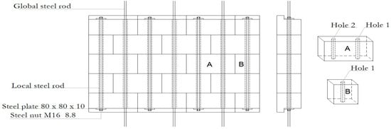 At the top end of the last panel, the reinforcements are connected to the head blocks by means of galvanized steel plates (80 × 10 mm) and a nut, M16 quality 8.8, to which a specific tightening value is applied to give the necessary global prestressing (Figure 8b).