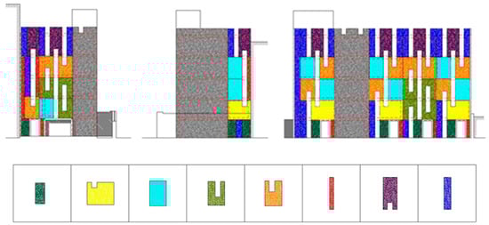 For the other panels, the feasibility study shows that with only one type of block and half-block, it is possible to industrially manufacture eight types of panels that allow for greater freedom in the architectural composition of the facade (Figure 4).