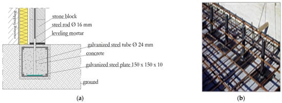The connection with the specially made reinforced concrete foundation is composed of various items, i.e., a galvanized steel plate (150 × 150 × 10 mm) anchored to the reinforced concrete reinforcement of the foundation, and a hollow galvanized steel cylindrical item consisting of a tubular rod (Ø 24) threaded and internally welded to the plate (Figure 7a). The plate is completely embedded inside the foundation and the tubulars protrude 5 cm from the top of the foundation (Figure 6a).