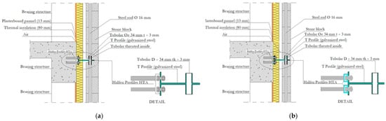 In this case, two T-shaped welded steel plates are connected to the vertically arranged Halfen profiles. The core of the T is inserted between one panel and the next and has a hole corresponding to which a tube of about 24 cm high is welded at mid-height. This tubular rod is inserted every 40 cm inside the second hole of all the blocks placed at the two lower and upper ends of the panels. This connection creates continuity between the panels and the beam and guarantees the transmission of horizontal actions from the existing structure to the bracing through the appropriate dimensioning of all the metal parts forming the node (Figure 8a). Halfen profiles in production are able to transfer seismic stresses acting on the entire building to the bracing panels due to their high mechanical capacities.