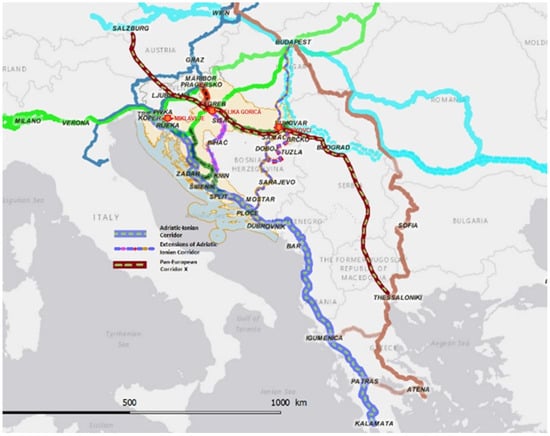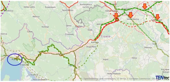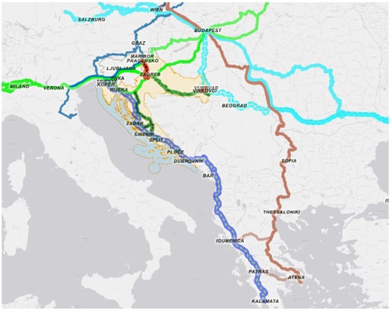 Croatia is located on two corridors of the basic TEN-T transport network, the Mediterranean Corridor and Rhine–Danube Corridor. The Mediterranean Corridor connects the south of the Iberian Peninsula, passes through the Spanish and French Mediterranean coasts through the Alps in northern Italy, then enters Slovenia and further towards the Hungarian–Ukrainian border. It is a road and railway corridor, and its integral part is the route Rijeka–Zagreb–Budapest (railway and road route that has become common in Croatia as PEC Vb Corridor) [12,13]. The Zagreb–Slovenia road and railway route continues to the Mediterranean Corridor, for which the name PEC X Corridor has become common in Croatia. Through this corridor, Croatia is connected in Ljubljana to the Baltic–Adriatic Corridor, which runs from the Baltic Sea through Poland, through Vienna and Bratislava to northern Italy. The Rhine–Danube Corridor is a multimodal route that connects Strasbourg, Frankfurt, Vienna, Bratislava, Budapest, from where one part forks towards Romania, and the other goes along the Danube between Croatia and Serbia and further to the Black Sea, and in Croatia it is known as PEC Corridor VII [12,14,15,16,17,18].