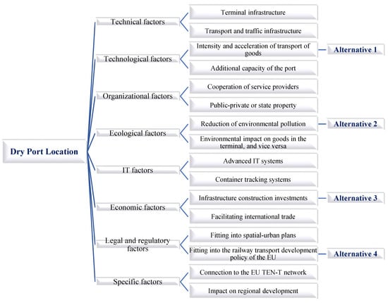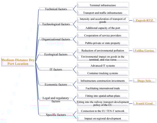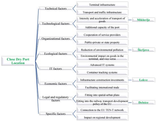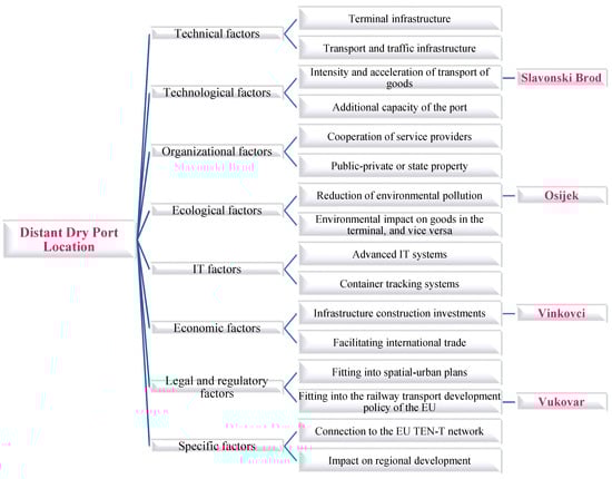 Table 1 shows the set of essential influential factors for the establishment of a new dry port. Horizontally, the factors are divided into technical, technological, organizational, ecological, information and communication (IT), economic, legal and regulatory, and specific. The influence of factors from the aspect of dry port location, which depends on all horizontal factors, is shown vertically.
