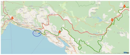 Figure 20 shows three possible dry port locations for Seaport Rijeka as well as Seaport Rijeka, and its positions in comparison with strategic transport routes (existing and planned). As shown in Figure 20, the strategic transport routes [14,17,18] include the following: