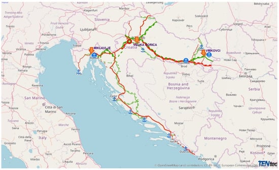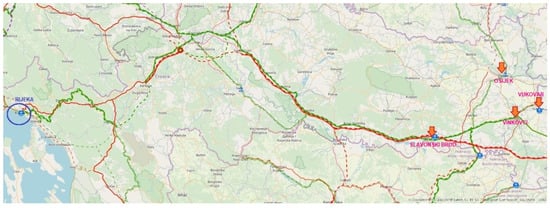 The former X Pan-European Railway Corridor, today’s Alpine–Western Balkan Rail Freight Corridor, runs through the City of Vinkovci. The proximity of the Danube (TEN-T corridor Rhine–Danube) and the route of the state road D2 along with it, and the highway Zagreb–Lipovac (former X Pan-European Corridor) influenced the formation of a significant transversal road connection that passes through the City of Vinkovci [1,55]. One of the largest railway hubs on the Croatian railways network is located in Vinkovci. The railway hub consists of a passenger and a freight terminal. The freight terminal consists of 50 tracks classified into four groups [9]. The advantage of the city of Vinkovci is that its transport routes, unlike Zagreb and Miklavlje, are not oriented to the directions of Western Europe, but also to the directions of Eastern and South-Eastern Europe, which are also used to transport goods unloaded in the Rijeka Seaport, primarily in the direction of the Orient–East-Med Corridor via Vukovar and RFC 10 to Thessaloniki [2,56].