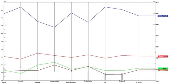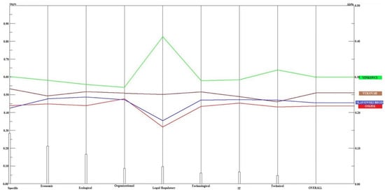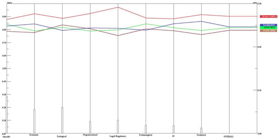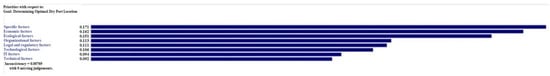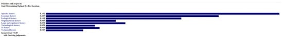When comparing the criteria for determining the location of a close dry port, which referred to eight criteria groups, and according to individual assessments of participants, which are aggregated into the group assessment, the most important criteria are specific factors (0.171). This is followed by economic factors (0.162), ecological factors (0.151), organizational factors (0.113), legal and regulatory factors (0.111), technological factors (0.106), and IT factors (0.094). The least important were the technical factors (0.092) (Figure 10).