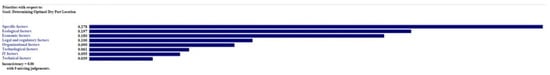 When comparing the criteria for determining the location of a medium-distance dry port, which referred to eight criteria groups, and according to individual assessments of participants, which are aggregated into the group assessment, the most important criteria are specific factors (0.278). This is followed by ecological factors (0.197), economic factors (0.180), legal-regulatory factors (0.100), organizational factors (0.090), technological factors (0.061), and IT factors (0.055). The least important were the technical factors (0.039) (Figure 11).