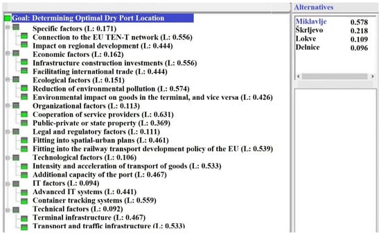 Quantitative factors were classified using the Expert Choice software tool ranking the alternatives directly according to the calculated values. In evaluating all groups of factors, participants used a scale in values from 1 to 9 to evaluate interrelated factors, which include two sub-criteria in each group. According to the assessment of the importance or influence of factors (Figure 13), the most acceptable alternative for the close dry port of the Seaport Rijeka is Miklavlje with a priority of 0.578. It is followed by Škrljevo with 0.218, Lokve with 0.109 and Delnice with 0.096.