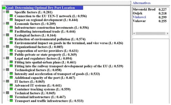 Quantitative factors were classified using the Expert Choice software tool ranking the alternatives directly according to the calculated values. In evaluating all groups of factors, participants used a scale in values from 1 to 9 to evaluate interrelated factors, which include two sub-criteria in each group. According to the assessment of the importance or influence of factors (Figure 17), the most acceptable alternative for the distant dry port of the Seaport Rijeka is Vinkovci with a priority of 0.299. It is followed by Vukovar with 0.255, Slavonski Brod with 0.227 and Osijek with 0.218.