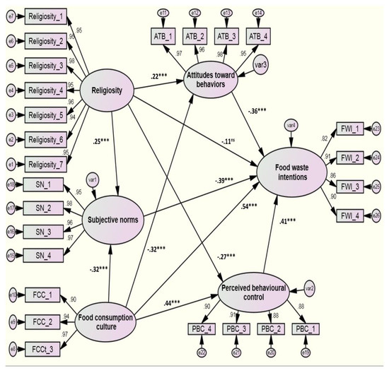 Likewise, the impact of religiosity on perceived behavior control is significant (β = −0.27, t-value = −3.461, p < 0.001) and the impact of perceived behavior control on food waste intentions is significant (β = 0.41, t-value = 7.233, p < 0.001) while the direct path is not, therefore perceived behavior control fully mediate the relationship between religiosity and food waste intentions which support H5.