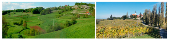 - Coherence among natural and cultural features/characteristics—e.g., cultural terraces that only slightly adapt to topography (Dolenjska, Notranjska)—see Figure 3;
