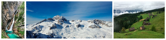 - Historical and symbolic meaning—places and landscapes have a strong associative (e.g., the Savica waterfall), symbolic (e.g., Triglav) and/or historical value (e.g., the WW1 remains along the Soča/Isonzo river battlefield)—see Figure 3;