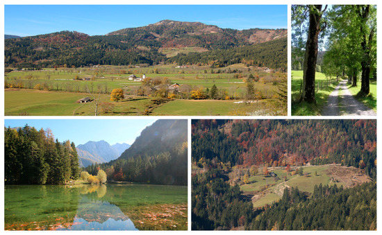 Every landscape has its own identity, which is based on (1) its physical characteristics, (2) the processes that take place in the landscape, and (3) the meanings that people attach to it [1]. Landscapes differ from each other and as such possess (more or less) unique geographical/spatial identities. The meanings people and societies attach to landscapes are prerequisites for establishing two other aspects of (landscape) identity—the identity of peoples and societies. Most individuals are attached to a certain place and/or a landscape and a share of their personal identities are derived from those places and landscapes. Similarly, cultural identity—a common/agreed identity of a social group—is built around the places and landscapes that a group inhabits and identifies with [1,2,3,4]. Collective memories often possess a strong spatial reference [5] since every event that is important for the social community takes place somewhere, and the location often gains the same importance as the event itself. Hrobat [6] defines this phenomenon as “the spatialization of time,” which is clearly expressed in the English language with the phrase “… the event took place …” Kučan [4,7], who researched the importance of landscapes for constructing national identity in Slovenia, argues that national identity is bound to the environment, to specific, and sometimes even idealized, types of landscape. These idealized types of landscape can be illustrated with a few important characteristics that are clearly expressed and that define their character, e.g., agricultural terraces, landmarks, etc. As such, they become a kind of “prototype” of a landscape. On the other hand, the concept of national identity is frequently built around places and landscapes that gained importance as symbols of a nation—either because of their unique and/or outstanding character and/or events that took place there. Many national landscapes are recognized as an inseperable part of national identity—e.g., in England [8,9], Scandinavian countries [10], the United States [11], and Slovenia [4,7].