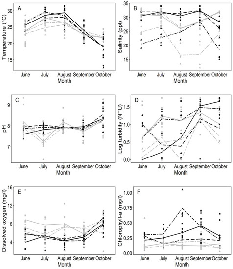 Spatial and temporal variation in water quality parameters of Delaware Inland Bays; (A) temperature, (B) salinity, (C) pH, (D) turbidity, (E) dissolved oxygen, and (F) chlorophyll-a during the first (2016, black dots and lines) and second year of sampling (2017, gray dots and lines). Sampling locations at Rehoboth Bay, Indian River Bay, and Little Assawoman Bay are indicated as squares, circles, and triangles, respectively.