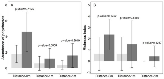 In IR Bay, the mean abundance of polychaetes was higher in sampling locations: under oyster gear (4.29 ± 0.39), one meter away (0.69 ± 0.64), and five meters away (0.95 ± 0.81) compared to those for the controls (1.43 ± 0.47, 0.23 ± 0.46, and 0.16 ± 0.30) (Figure 3A). The same results were obtained for the richness index (Figure 3B). However, the differences were not statistically significant for both the abundance and richness index.