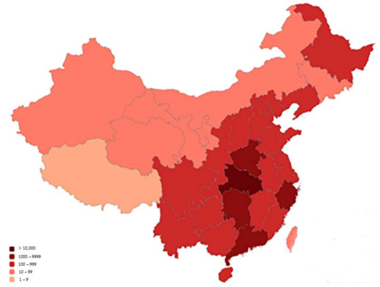 In a pandemic, the contract performance, cost, and schedule of each project will be affected to a different degree. Therefore, in addition to the basic evaluation indicators, it is also necessary to consider the pandemic indicators of the project location. The time point of 29 February 2020 was selected. According to the data released by the China National Health and Wellness Commission, the BAIDU Pandemic Map provides information on the pandemic situation of each area, and the pandemic level of each province (municipalities directly under the authority of the central government and autonomous regions) is determined by the cumulative number of confirmed cases [28]. For details, see Figure 1.