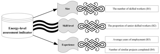 The energy-level assessment indicator system of a construction team in a project pool is presented in Figure 2.